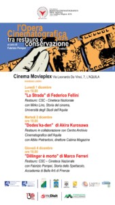 L’Istituto Cinematografico dell’Aquila “La Lanterna Magica” ETS presenta la seconda edizione del ciclo “L’opera cinematografica tra restauro e conservazione”, in programma al Cinema Movieplex (Via Leonardo Da Vinci, 7 – L’Aquila) l’1, il 2 e il 4 dicembre 2025, a cura di Fabrizio Pompei, docente di Storia dello Spettacolo e Regia all’Accademia di Belle Arti di Firenze.